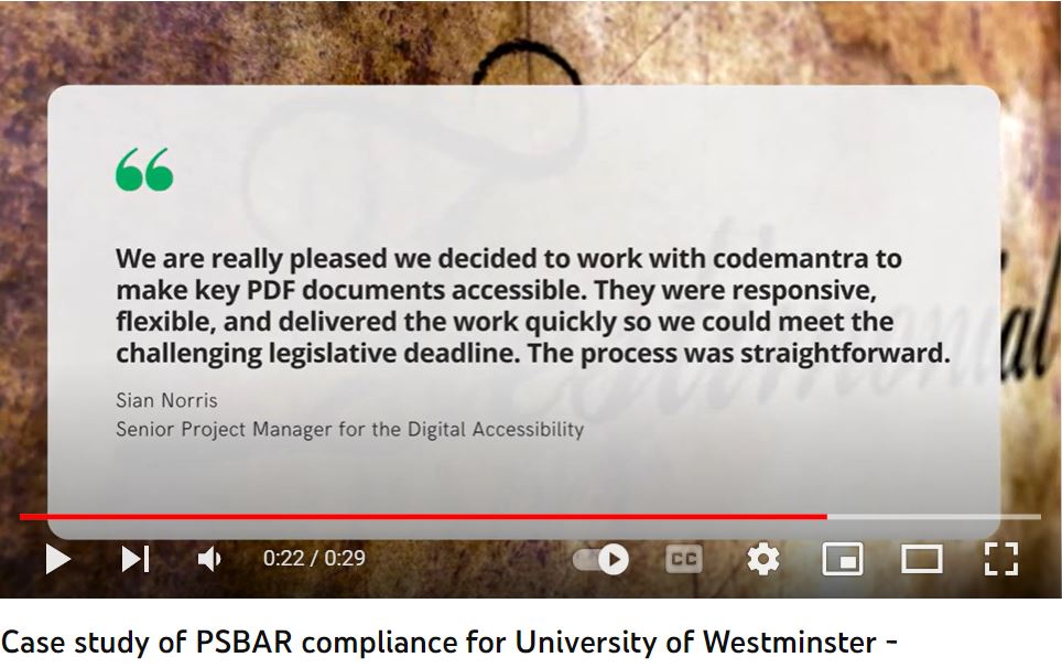 Click here to see a workshop session covering the Impact of Digital Document accessibility by codemantra, as part of the John Slatin Access U 2020 conference.